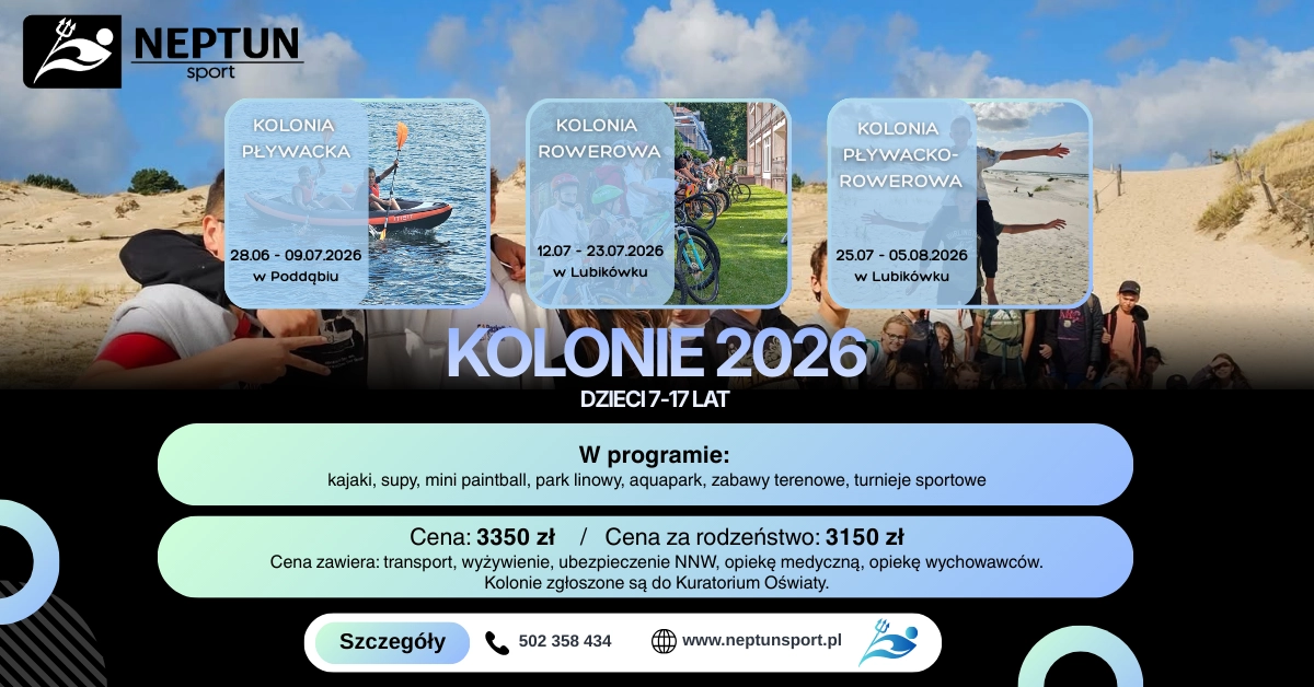 Zachęcamy również do przejrzenia aktualnej oferty kolonii letnich i zimowych. Organizujemy pełne atrakcji wyjazdy, podczas których młodzi uczestnicy rozwijają sportowe pasje, spędzają czas w pięknej okolicy i biorą udział w licznych, niezwykle interesujących aktywnościach.